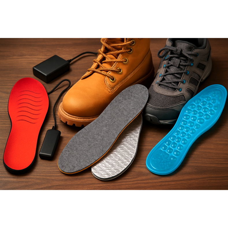 Vyhřívané vložky, napájené z baterie nebo nabíjené přes USB, udrží vaše nohy v teple během mrazů. Nabízejí různé stupně ohřevu (obvykle 3-5 stupňů), dobu provozu od 4 do 10 hodin. Ideální pro outdoorové aktivity, práci v chladu a zimní sporty. Tepelně izolační vložky z materiálů jako vlna, Thinsulate, hliník odrážejí tělesné teplo a pasivně zadržují teplo. Lehčí, levnější, nevyžaduje nabíjení. Skvěle se hodí do zimních trekových bot a pracovních bot. Chladivé vložky s chladivým gelem poskytují úlevu v horkých dnech, snižují pocení a zabraňují přehřívání nohou. Reaktivováno v chladničce. Ideální pro kurýry a stavební dělníky v létě.