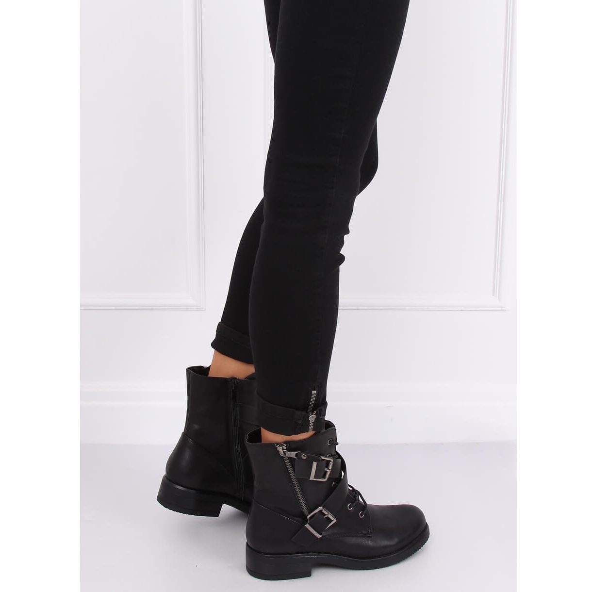 Černé vojenské pracovní boty C581 jsou perfektní volbou pro ženy, které oceňují styl a pohodlí. Tyto šněrovací ploché kozačky dokonale odpovídají aktuálním módním trendům a kombinují klasický design s moderními akcenty. Překřížené pásky s přezkami jim dodávají charakter a zároveň je činí univerzálními - ideální pro každodenní styling.
