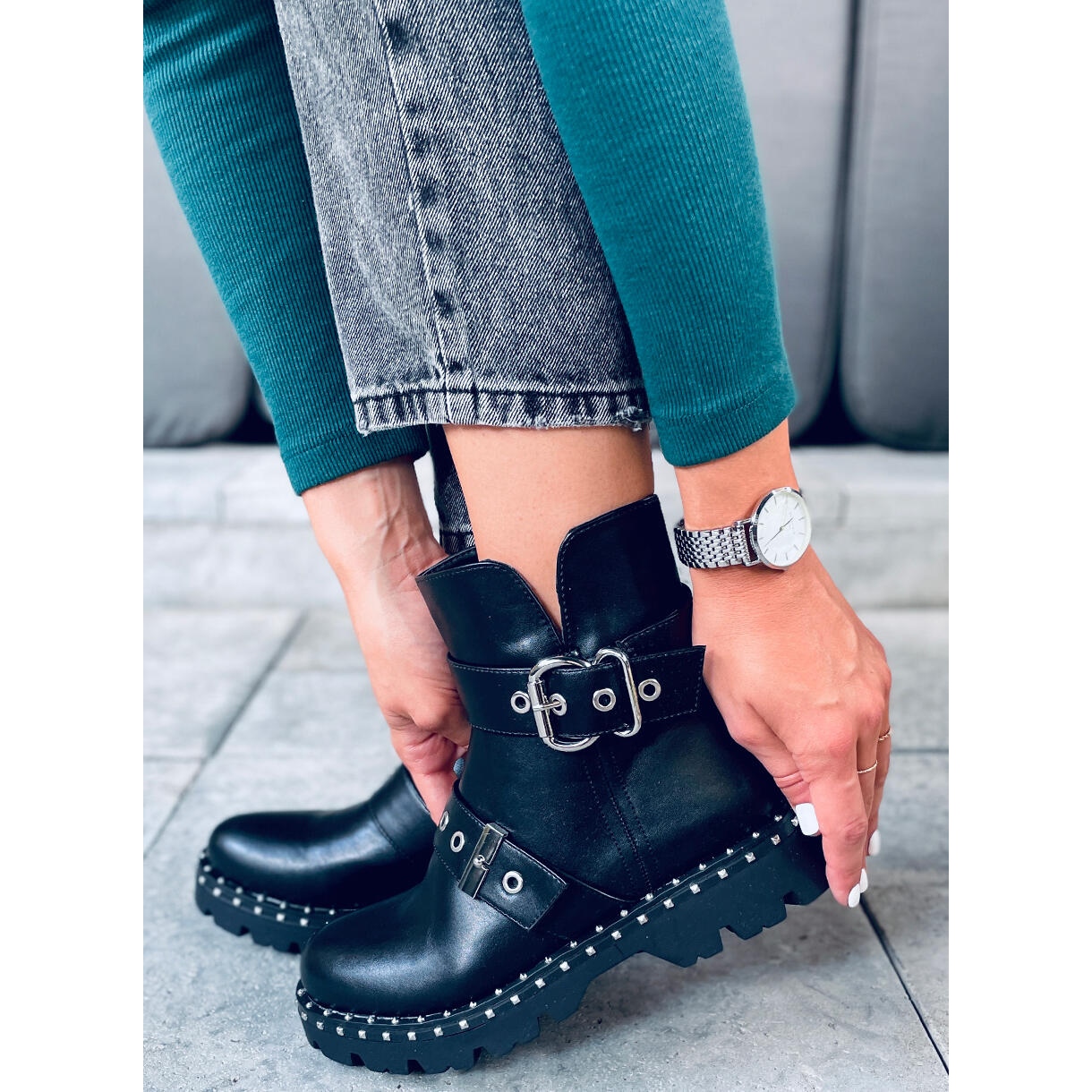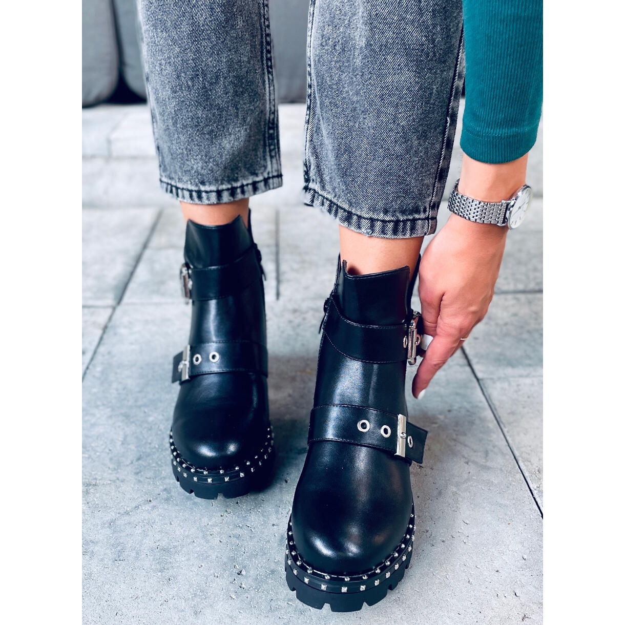 Objevte novou dimenzi stylu s vojenskými kotníkovými botami Soprano Black! Tyto extrémně módní dámské kozačky s chráničem v elegantní černé barvě se vyznačují stříbrnými cvočky a přezkami, což jim dodává výrazný, rockový charakter. Perfektní pro každodenní styling, budou fungovat jako perfektní doplněk k ležérním i odvážnějším outfitům.