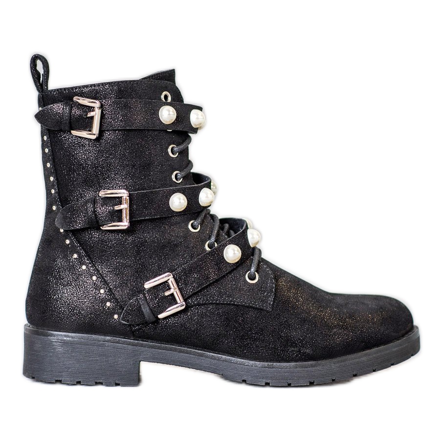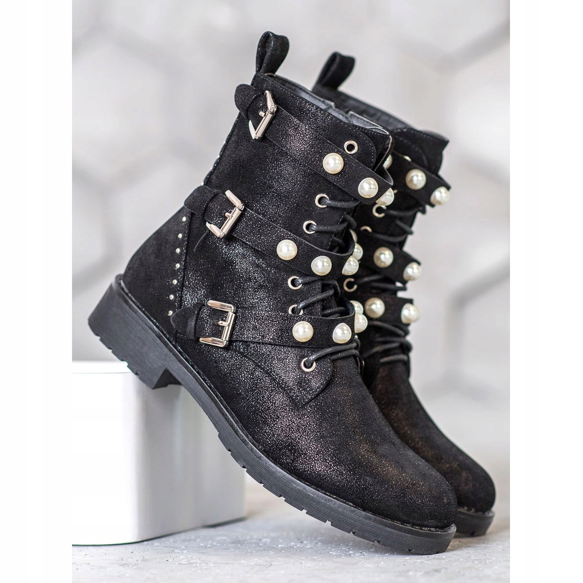 Tyto stylové kozačky mají šněrování vpředu a praktický zip na boku, díky kterému se snadno nazouvají i vyzouvají. Jejich originální vzhled navíc zdůrazňují opasky s přezkami zdobenými perličkami a drobnými lesklými kamínky, které jim dodávají rockový charakter.