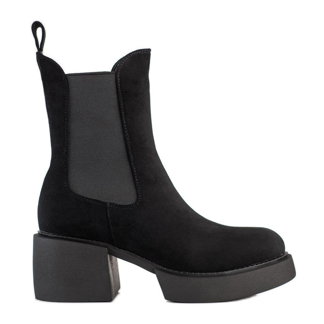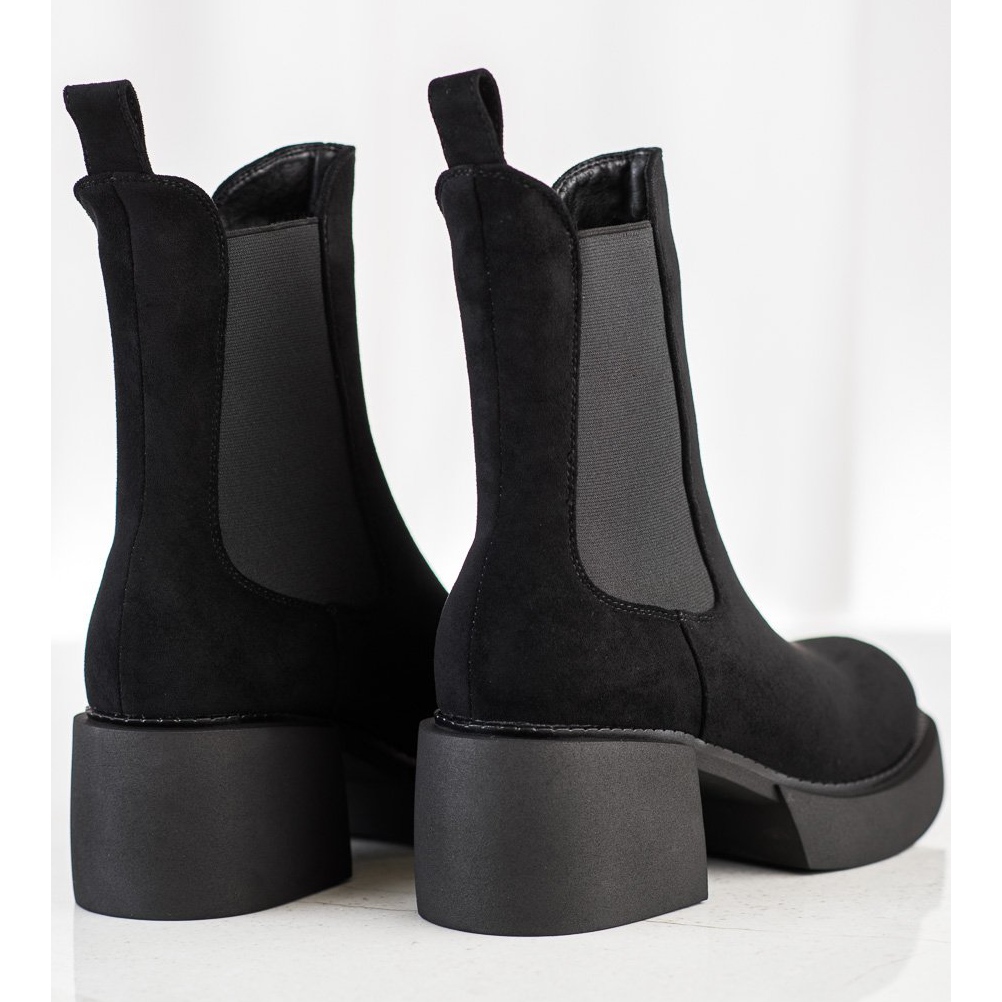Vysoký svršek, který sahá nad kotník, je vyroben z ekologické kůže imitující semiš, která botám dodává šik vzhled. Měkký, zabudovaný podpatek a textilní vnitřek zajišťují pohodlí při nošení a přizpůsobení noze. Navíc 6,5 cm vysoký blokový podpatek a 2 cm vysoká platforma zajišťují stabilitu a lehkost kroku.
