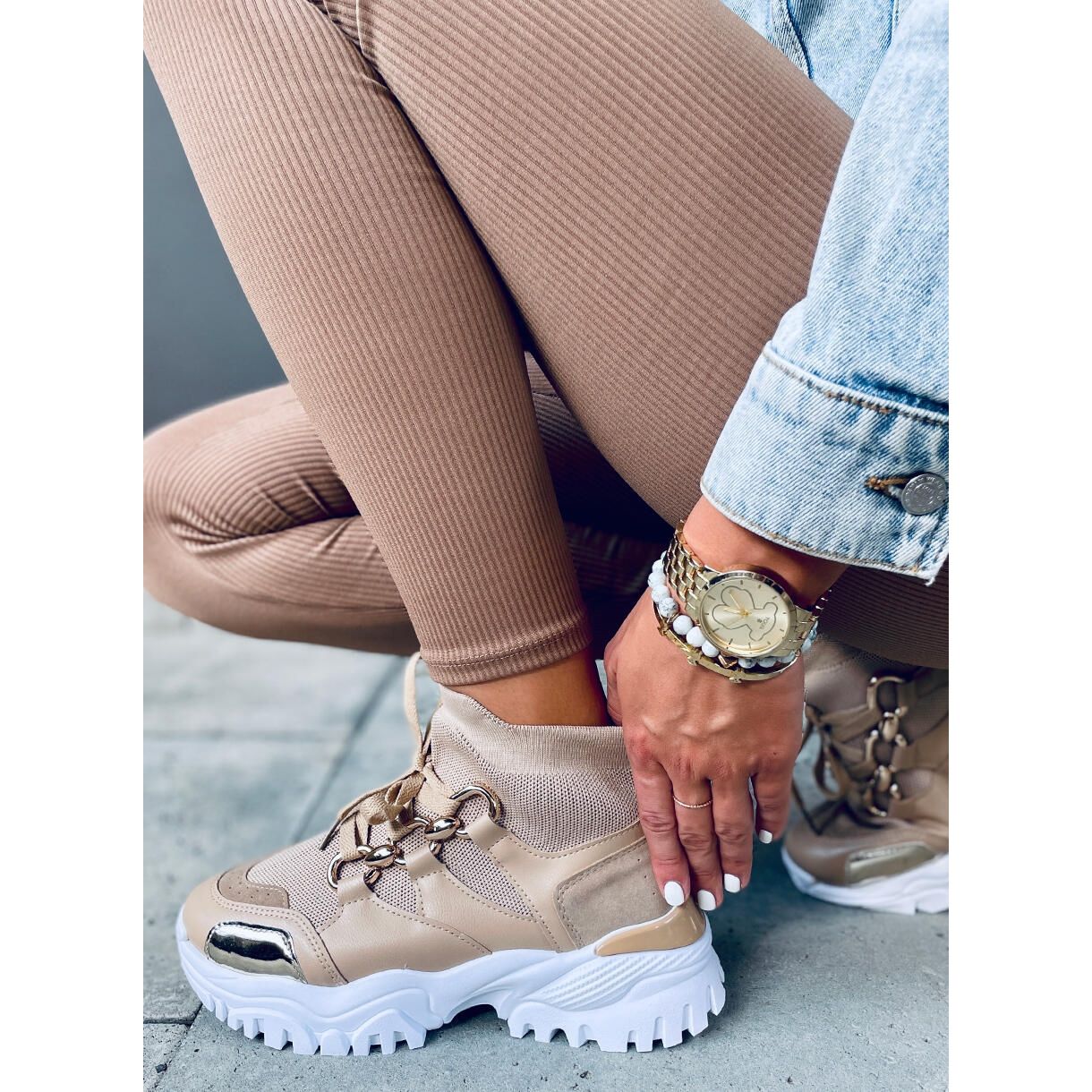 **Béžové sportovní boty s vysokými ponožkami Petra Khaki** jsou ideální volbou pro ženy, které oceňují módní vzhled a každodenní pohodlí. Tyto jedinečné boty nasazené na silné, syntetické podrážce přitahují pozornost zlatými doplňky, které jim dodávají jedinečný charakter.