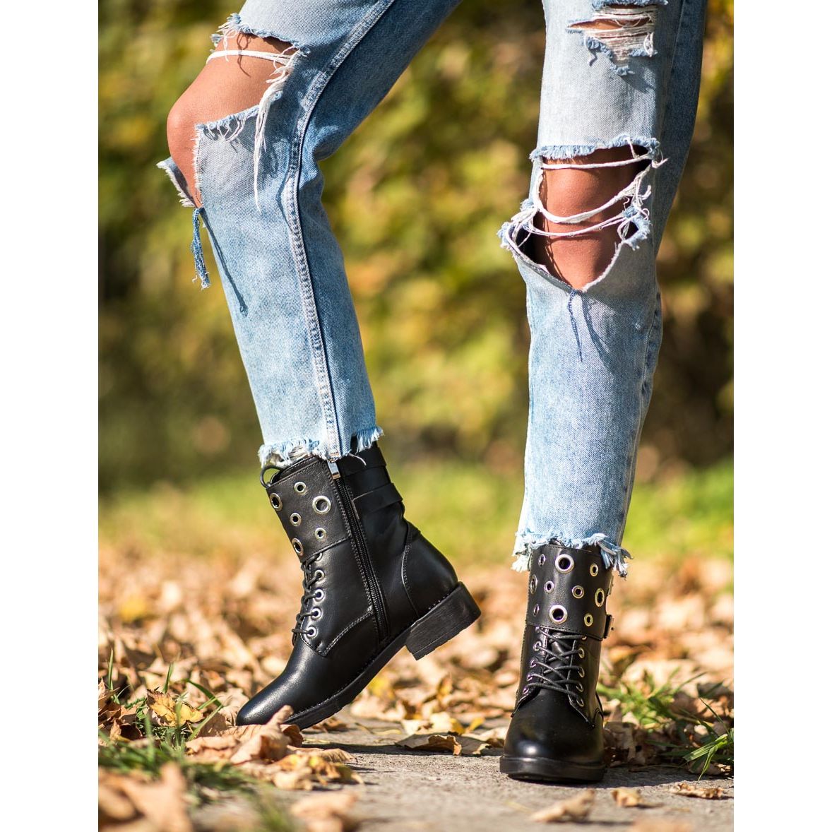Vysoké svršky, sahající až nad kotník, účinně chrání vaše nohy před chladem a vlhkostí, což z nich dělá skvělou volbu pro chladnější dny. Pevná podešev s nášlapem zaručuje stabilitu a pohodlí při chůzi. Další výhodou jsou kamínky a ozdobné přezky, které dodávají botám rockový charakter a dělají z nich módní must have v každém šatníku.