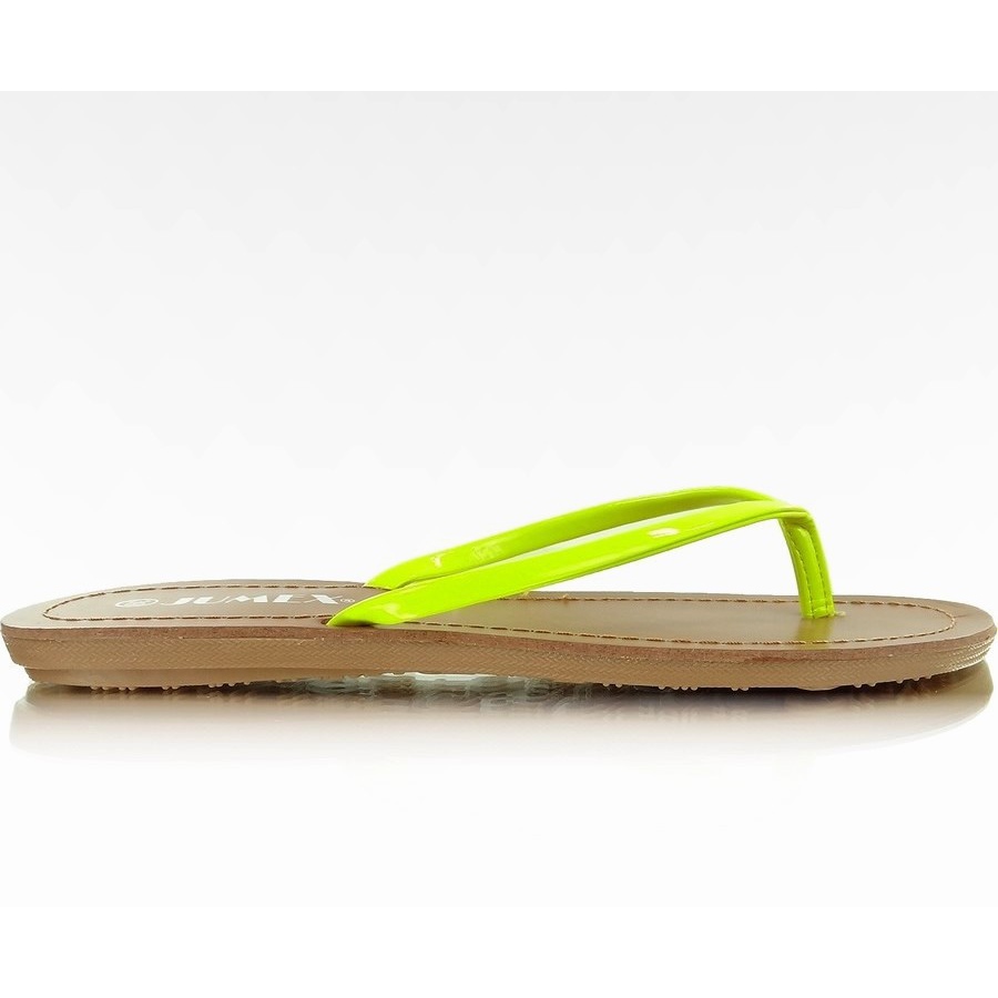 Energetické klasické žabky ideální na léto. Tenký, lakovaný proužek krásně ladí s intenzivní žlutou barvou a "masitá" podrážka poskytuje pohodlnou oporu a dobrou oporu chodidla. Díky minimalistickému designu bez vzoru se žabky hodí jak k plážovému stylu, tak k městskému, každodennímu vzhledu.