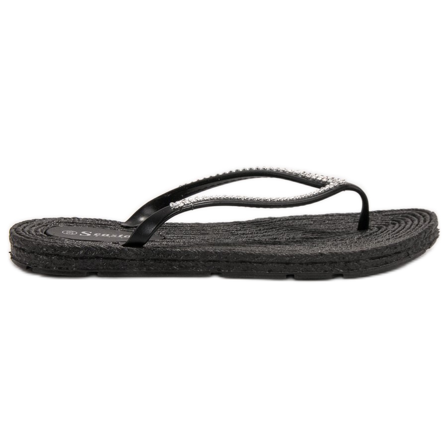 Žabky Seastar s kubickými zirkony v černé barvě jsou ideální nabídkou pro ženy, které si cení stylu a pohodlí každý den. Díky otevřené špičce a nazouvacímu uzávěru jsou tyto žabky mimořádně praktické a snadno se koupí. Vyrobeny z vysoce kvalitních materiálů - pryže a syntetických prvků, zaručují pohodlí během letních dnů.
