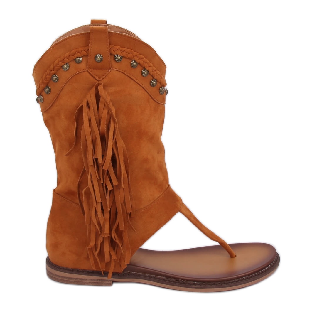 Představujeme kovbojské žabky camel NS131P v hnědé barvě - tuto sezónu musíte mít! Tyto elegantní žabky se svrškem v kovbojském stylu jsou perfektní volbou pro ženy, které chtějí svému letnímu looku dodat trochu originality. Ozdobné třásně dodávají jedinečný charakter, díky čemuž jsou tyto boty výrazným akcentem jakéhokoli stylu.