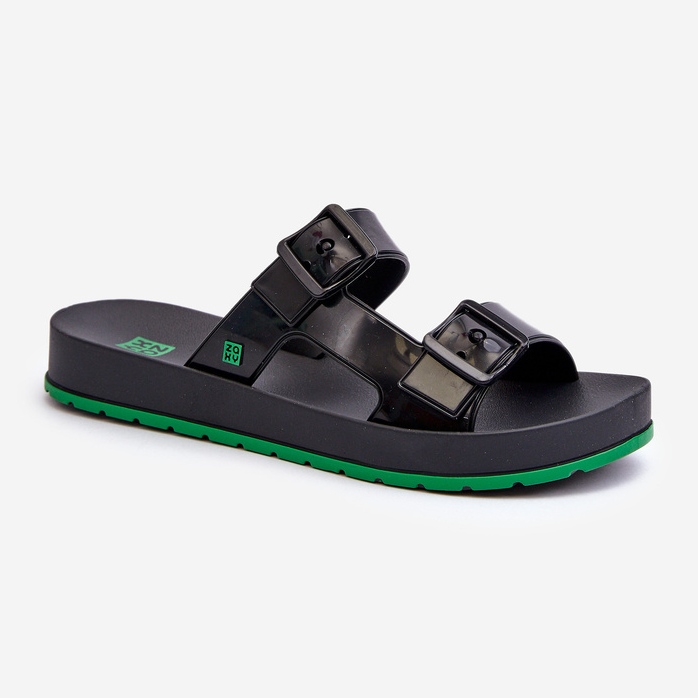 Tyto žabky jsou charakterizovány posuvnou sponou, nedostatkem nosu a plochou podrážkou s výškou 3 cm, což zajišťuje maximální pohodlí při chůzi. Další podrobnosti, jako je zelená barva chodidel, jim dávají moderní vzhled.