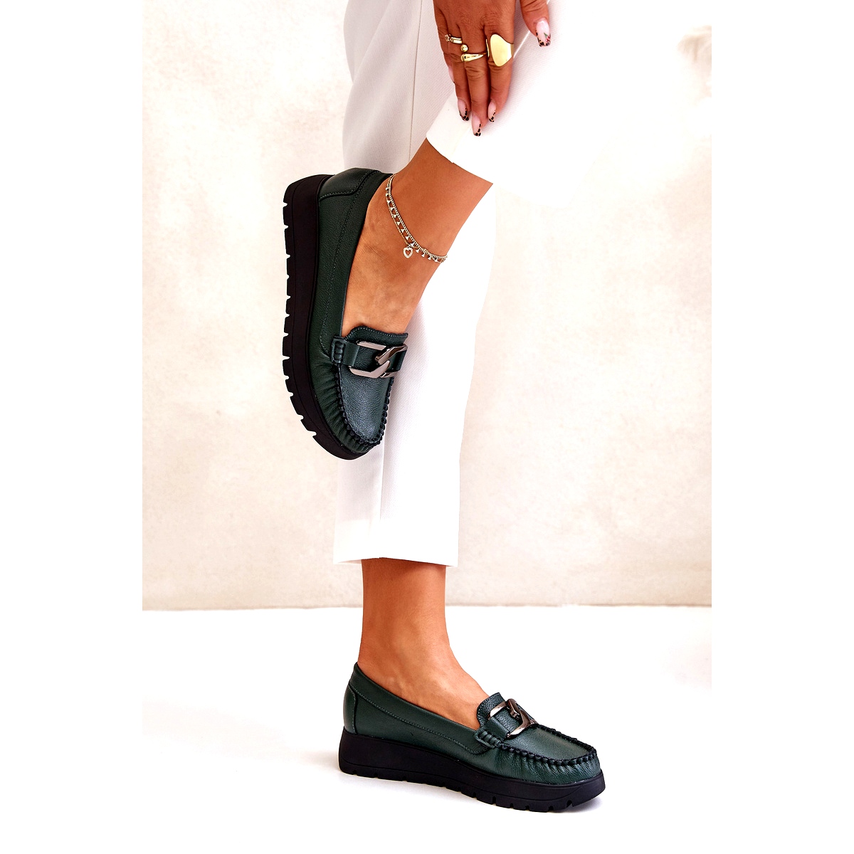 Podrobnosti: Zazoo 10141 Kožené mokasíny Na Platformě S Dekorací, Tmavě Zelená