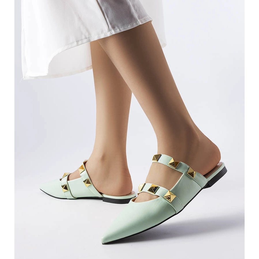 Elegantní, skluz -v ruckman žabky s výrazným špičatým nosem. Postaveno -na přední straně a na bocích, s výřezy na patě a metatarsu, namontované na ploché podrážce (pata/platforma přibližně 1 cm, celková výška přibližně 2 cm). Zdobené dvěma pruhy s kovovými čepy ve zlaté barvě, které vytvářejí módní, mírně rockový charakter. Barva výrobce: zelená; Černá podešev.