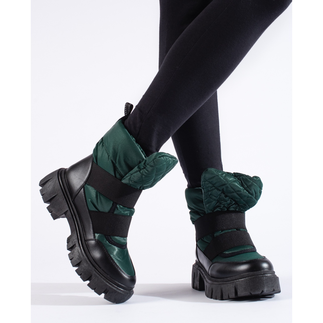 Dámské sněhule Shelovet v zelené a černé barvě jsou perfektní volbou pro každodenní zimní styling. Jsou vyrobeny z vysoce kvalitního, 100% textilního materiálu, poskytují pohodlí a dostatečnou izolaci, což z nich dělá ideální obuv do chladných dnů. Jejich plná špička a zabudovaná měkká pata zaručují pohodlí při nošení a nazouvací zapínání na gumičku usnadňuje nazouvání.