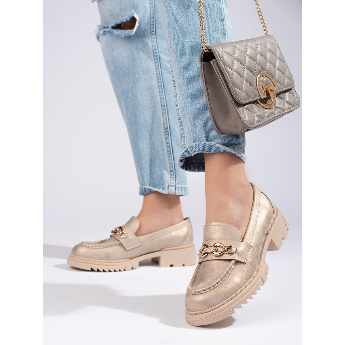 Profilované zlaté mokasíny upoutají pozornost a dodají kouzlo každému stylingu. Jsou vyrobeny z vysoce kvalitní ekologické kůže, díky čemuž jsou šetrné k životnímu prostředí a cenově dostupné ve srovnání s alternativami z přírodní kůže. Pozornost na uživatelský komfort je však patrná na měkké přírodní kůži stélky, která zajišťuje chodidlům dostatečné odvětrávání a pohodlí i po dlouhodobém používání.