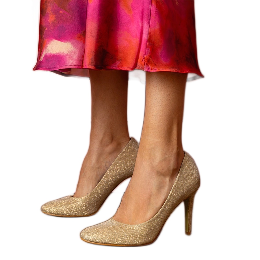 Zlaté čerpadla na brokátovém povrchu jsou kvintesence elegance a záře, kterou by měla mít každá žena ve svém šatníku. Tyto oslnivé boty ve stínu zlata, díky jemnému mandlovému Nosc, jsou ideální jak pro večerní výlety, tak pro formální události, kde chcete zářit.
