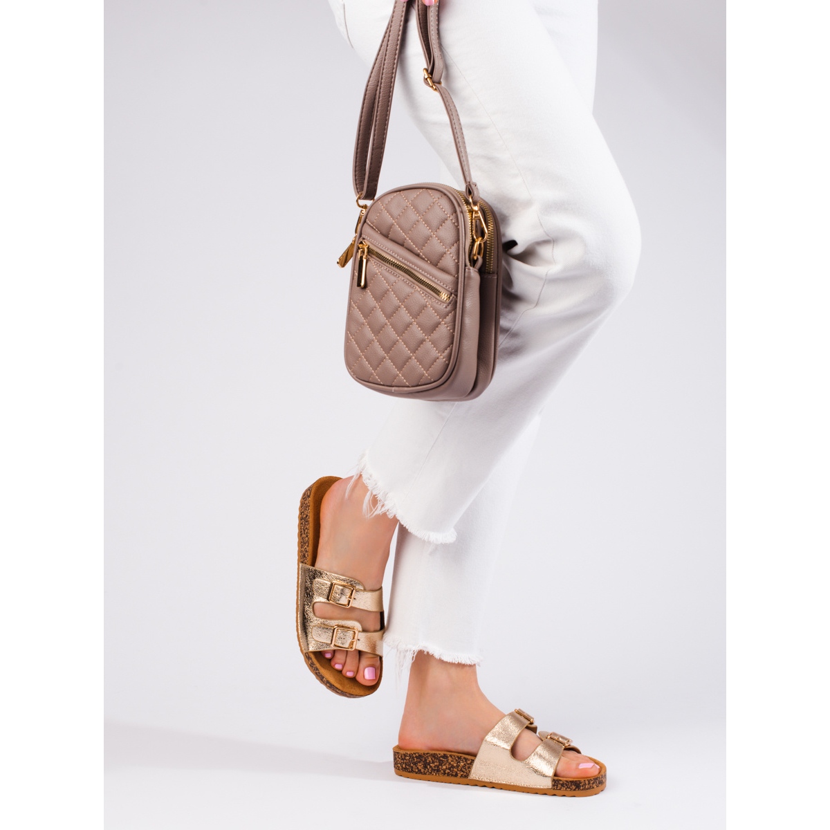 - Modelka: dámské pantofle s přezkami