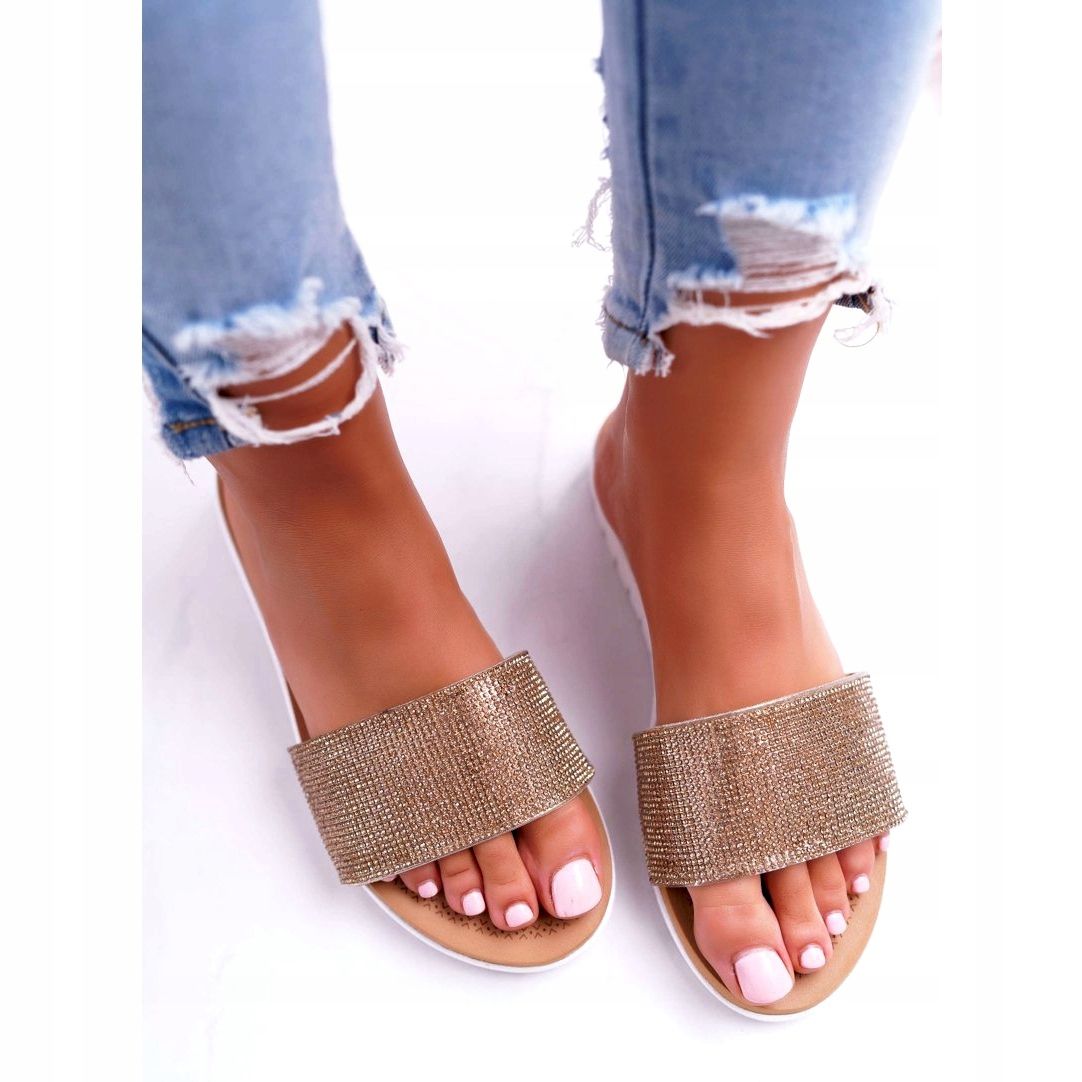 Potěšte své okolí krásně zdobenými kamínky, které dodávají těmto žabkám jedinečný lesk. Zlatá barva žabek zaručí, že zaujmou a skvěle zapadnou do různých letních stylů. Bílá podrážka dokonale kontrastuje se zbytkem boty a vytváří módní a výrazný vzhled.