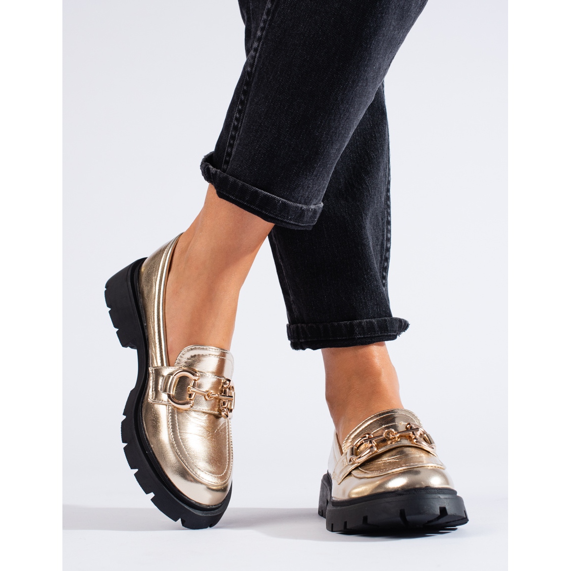 Zlaté mokasíny na tlustém podrážce Shelovet - styl a pohodlí v jednom.