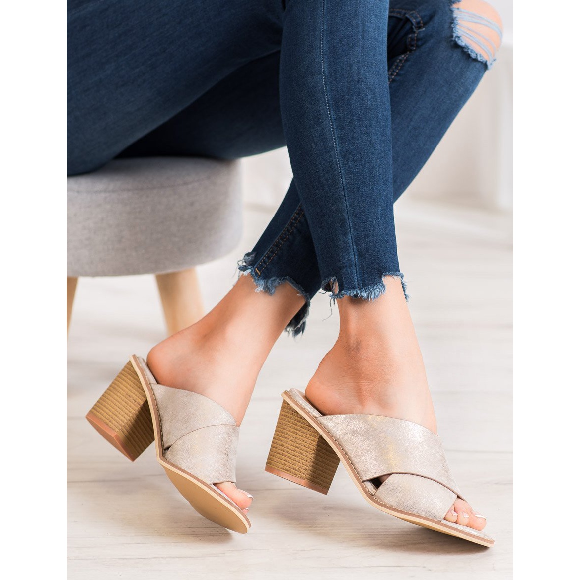 Žabky se vyznačují 7centimetrovými podpatky na pevném blokovém podpatku, které opticky zeštíhlují postavu, dodávají lehkost a eleganci. Díky použití otevřené paty a nazouvacího provedení je jejich nazouvání a sundávání extrémně jednoduché a pohodlné.