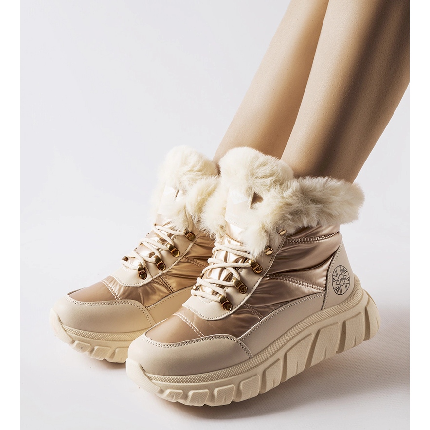 Vysoká platforma vysoká 4 cm umožňuje izolovat nohy od studeného povrchu a zároveň dodává botám originální charakter. Výška samotných sněhulí je 17 cm, což poskytuje skvělou ochranu před chladem. Bez vzoru, zato s jedinečnou zlatavou barvou budou boty dokonalou oporou v šedivé zimě.