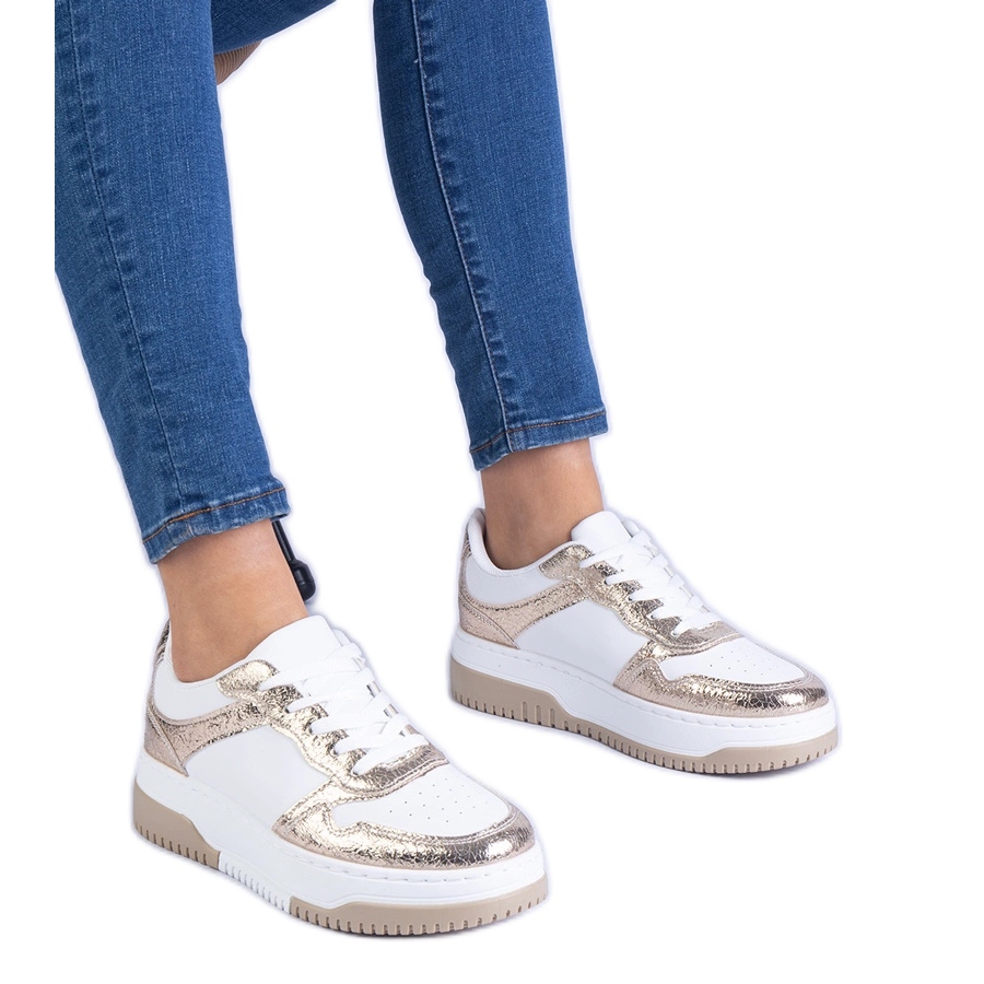 Zlaté tenisky na husté podrážce K1716 jsou perfektní volbou pro každou ženu, která chce do svého šatníku přinést malou záři. Tyto originální boty, vyrobené z vysoce kvalitní organické kůže, kombinují moderní design s módou a jejich kovový zlatý povrch s bílými akcenty přitahuje zrak a přidává styl.