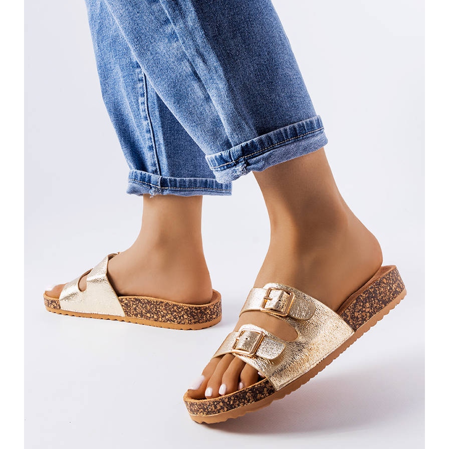 Představujeme zlaté zlaté žabky Cincinna s korkovou podrážkou - perfektní volba pro nadcházející léto! Tyto módní žabky na platformě vynikají nejen svým stylovým vzhledem, ale také výjimečným komfortem nošení. Vyrobeny z vysoce kvalitní ekologické semišové kůže, s ozdobnými přezkami, dodají eleganci každému každodennímu stylingu.