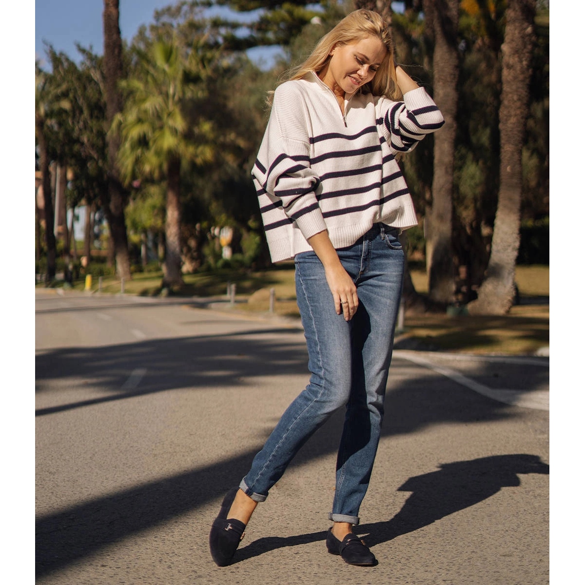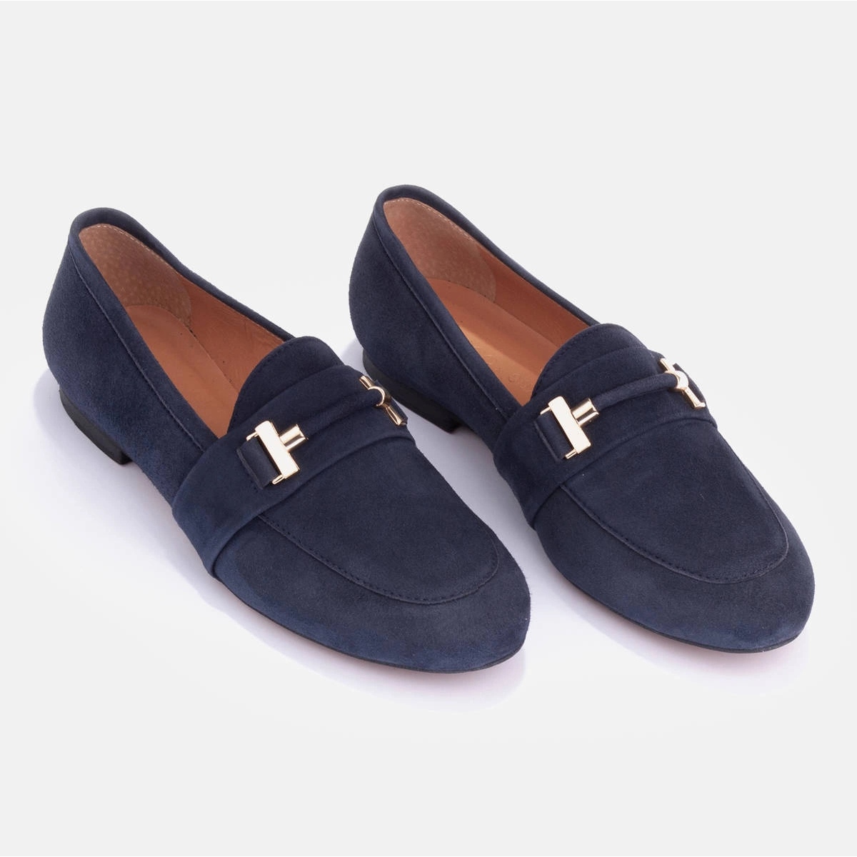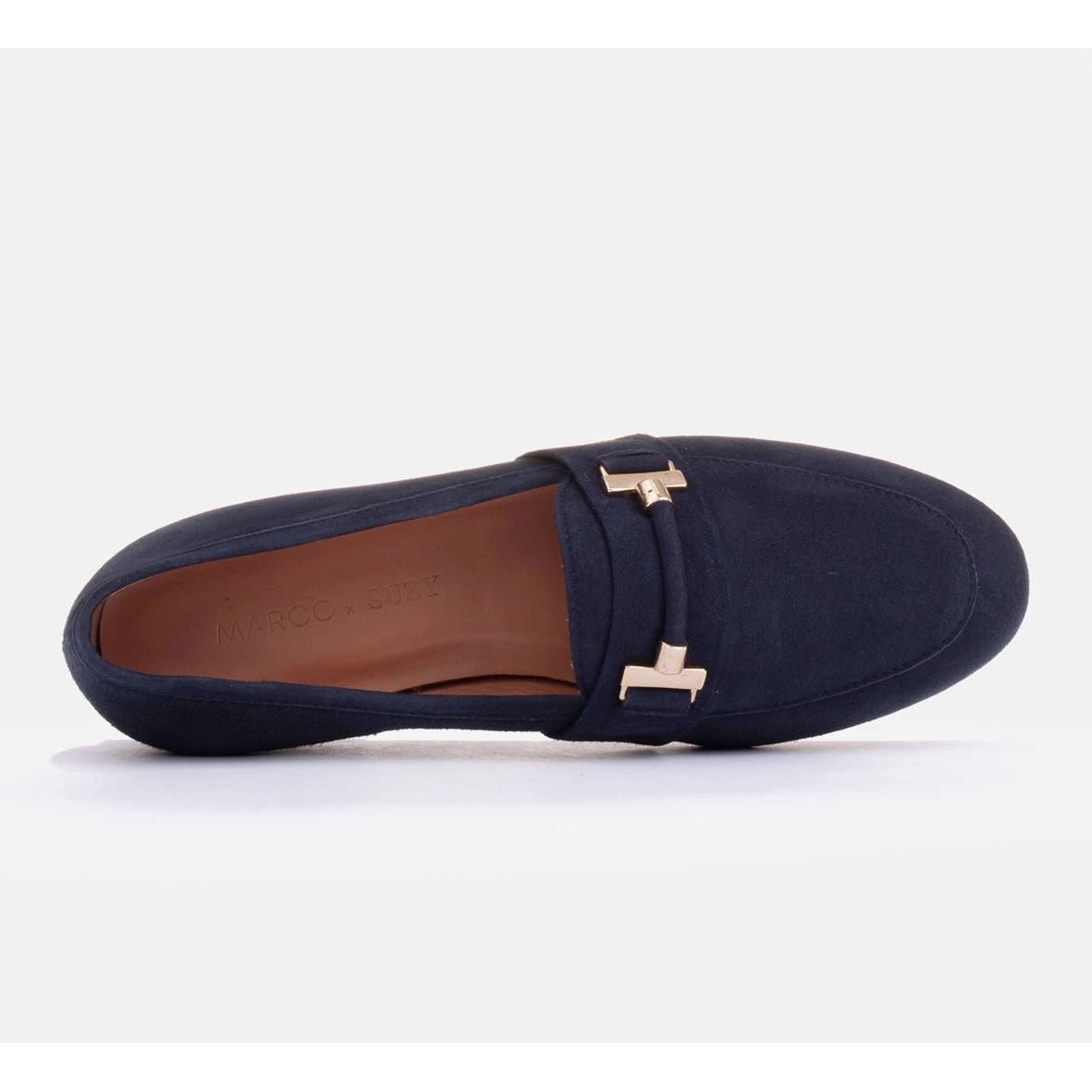Produkt, kterým je Marco Shoes Loafers se zlatým zdobením, jsou dámské boty, které patří do kategorie baleríny. Tento model je modré barvy, téměř celý vyroben z přírodní semišové kůže - tento materiál je použit jak ve svršku, tak uvnitř boty a zároveň je stélkou. Zdobení v podobě zlatých kamínků dodává botám elegantní charakter.